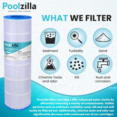 💧【Purified】Poolzilla filter cartridges offer enhanced water clarity by efficiently removing a variety of contaminants. Visible particles such as sediment, turbidity, sand, silt, and rust will easily be filtered out. Additionally, chlorine taste and odor can significantly decrease with continued use of our cartridges.