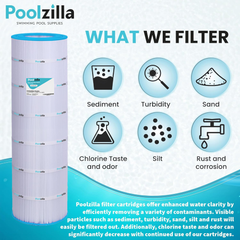 š§ćPurifiedćPoolzilla filter cartridges offer enhanced water clarity by efficiently removing a variety of contaminants. Visible particles such as sediment, turbidity, sand, silt, and rust will easily be filtered out. Additionally, chlorine taste and odor can significantly decrease with continued use of our cartridges.