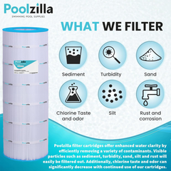đ§ăPurifiedăPoolzilla filter cartridges offer enhanced water clarity by efficiently removing a variety of contaminants. Visible particles such as sediment, turbidity, sand, silt, and rust will easily be filtered out. Additionally, chlorine taste and odor can significantly decrease with continued use of our cartridges.