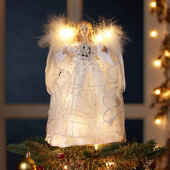 - This battery operated silver and white angel treetop from Kurt S. Adler is a beautiful addition to your holiday décor or Christmas tree. She is wearing a stunning white dress with silver sequined accents with beautiful white feathered wings. This treetop runs on 3 AA batteries and has a timer for your convenience.
