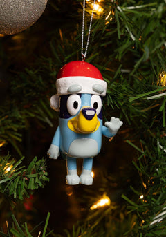 - This ornament features Bluey, a Blue Heeler puppy. Bluey is wearing a red and white Santa hat and he is waving hello!