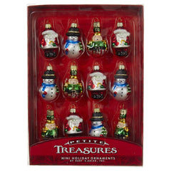 - This Kurt Adler 12 Piece Petite Treasures Glass Ornament Set is a fun and festive addition to any Christmas tree décor. This 12 pieces glass set includes a variety of characters that all represent Christmas. This set includes nutcrackers, Santas and snowmen.
