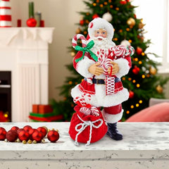- This 10.5-Inch Santa with candy and sack from Kurt Adler is a fun and festive addition to any holiday decor. Santa Claus is featured here in his classic red and white suit and hat. He has an armful of classic peppermint Candies and has a large red sack at his feet also filled with peppermint Candies.