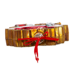 - Hangs from red ribbon