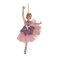 - Bring the joy of ballet to any holiday décor or Christmas tree. This graceful ballerina stands posed on one leg with delicate pink point shoes. Her costume features a pink tutu with a floral design on the bodice in pink, white, gold and purple. Intricate details such as gold trim on the bodice are shown. Made of resin and cloth | Hangs from a gold string More Information UPC 086131275548 Split 6 Case 36 Color Pink Item Size 7in Packaging Polybag With Rat Tail