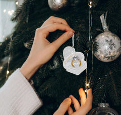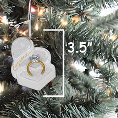 - Wedding ornament features a ring in a heart-shaped box, with "engaged" printed.