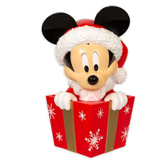 - This 8-Inch Disney© Mickey Mouse Tree Topper from Kurt Adler is a fun and festive addition to any holiday décor! Perfect for Disney fans of every age, this piece features Mickey Mouse festively dressed in a Santa Claus outfit, sitting in a red and white decorated present. It measures 8 inches high and does not include any lights.