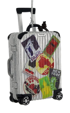 - Travel Luggage Ornament for travel enthusiast and world travelers. This travel luggage ornament is a unique addition to any holiday decor or Christmas tree. It includes a silver rolling luggage case with travel stamps and a luggage tag for personalization. Made of resin and measures 3.75 inches.