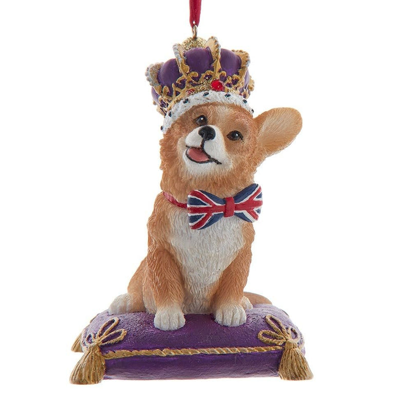 - Kurt Adler's Queen's Corgi ornament is a festive addition to any holiday décor or Christmas tree. It features a Pembroke Welch Corgi with a Union Jack bow tie and a jeweled Queen's crown sitting on a purple pillow with gold cord designs.
