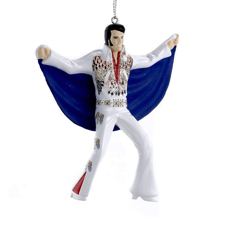 - This Elvis in eagle suit with cape ornament from Kurt Adler is a fun and festive addition to any holiday decor or Elvis collection - perfect for any Elvis fan! This ornament features the King striking his classic stage pose holding his wide blue cape out, wearing his signature white jumpsuit, complete with an intricate eagle in rhinestones on the chest.
