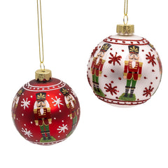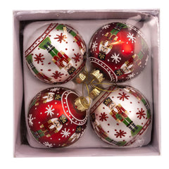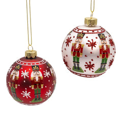 - Kurt Adler's Glass Nutcracker Design Ball Ornaments are exquisite and classic holiday decorations that add a touch of traditional elegance and charm to your Christmas tree or festive display. These red and white glass ball ornaments feature a beloved nutcracker design, a timeless symbol of the holiday season. Each set includes four ornaments, which are divided into two assorted colors. The nutcracker design on these ornaments is finely detailed and beautifully rendered, capturing the essence of this iconic and festive figure. These ornaments are finished with a red and white glittered snowflake pattern to evoke the regal and ornate appearance of traditional nutcrackers. These ball ornaments are made of glass and are typically of a standard 60mm size, making them a perfect choice for decorating a Christmas tree. The assorted colors add a touch of variety and complement each other beautifully when hung on the tree. They are perfect for those who appreciate the timeless and classic elements of Christmas decor. They are a wonderful addition to any Christmas tree and can be displayed year after year, creating a sense of nostalgia and holiday tradition in your home. These ornaments celebrate the magic and heritage of Christmas with their elegant nutcracker design.
