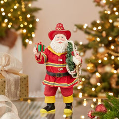 - Part of Kurt Adler's Fabriché™ collection, the 11-Inch Fabriché Fireman Santa with Wreath and Hose is a festive holiday decoration featuring a fireman Santa Claus figure. The Santa is dressed in a traditional fireman's uniform, complete with a red and gold coat, black boots, and a fireman's hat. He is holding a gift in one hand and in the other is a holiday wreath wrapped with a "Merry Christmas" fireman's hose. The intricate details make this figurine a truly unique and special addition to your holiday décor. It stands at 11 inches tall, making it the perfect size for display on a mantel, tabletop, or shelf. This unique and charming decoration is sure to bring cheer and joy to any holiday setting.