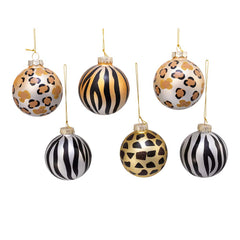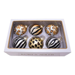 - Bring the jungle to your home with these Gold, Silver and Black Animal Glass Ball Ornaments from Kurt Adler. These six glass ball ornaments feature four assorted animal designs! This set features cheetah, leopard, zebra, and tiger animal prints with glitter.