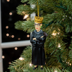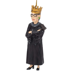 Features and Benefits:- Add some holiday charm to your living space with this ornament; Features Ruth Bader Ginsburg in Supreme Court Justice robe and signature white lace collar holding gavel in hand and wears "Notorious" gold crown