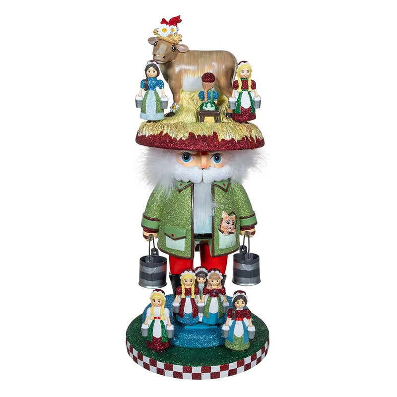 - This 16.5-inch Hollywood Nutcrackers 8 Maids A Milking Nutcracker from Kurt Adler is a unique and festive holiday decoration that brings the charm of the classic Christmas carol "The Twelve Days of Christmas" to life. Crafted with meticulous attention to detail, this nutcracker captures the essence of the song's imagery and adds a playful touch to your seasonal decor. This nutcracker is inspired by the eighth verse of The 12 Days Of Christmas carol, where "eight maids a-milking" are depicted. The nutcracker showcases eight maids in traditional attire, holding milk jugs, symbolizing the agricultural theme of the verse. It is adorned with intricate details, including glitter, metallic paint, and vibrant colors, that enhance its festive appeal. These elements add a touch of sparkle and magic to the nutcracker's attire and accessories. Displaying this nutcracker in your holiday decor brings the beloved Christmas carol to life and infuses your space with the spirit of the season. Its playful design, song-inspired theme, and festive imagery create a joyful and spirited ambiance, making it a cherished and merry addition to your holiday celebrations.