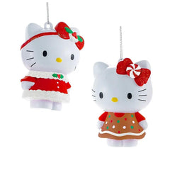 - Give the gift of these adorable Hello Kitty Christmas Ornaments to your lover of this iconic character! Perfect for children's Christmas trees, themed displays or a new addition to your traditional Christmas decor. Officially Licensed. Painted with features of the classic Kitty figure dressing in their most festive Christmas dresses. Made of quality, durable plastic material. Purchase is for a set of 2 individual pieces in assorted colors that measure approximately 3.25 inches and includ attached loop for hanging. WARNING: Not a toy. For decorative purposes only.