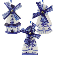 - Decorate your home with these delft blue windmill ornaments from Kurt Adler. This assortment comes with three differently designed windmills. Each ornament is finished off with a classic delft blue design. Windmill blades are free spinning. Each windmill measures approximately 3 inches tall. Includes blue ribbon for hanging. Made of porcelain. Made in China.