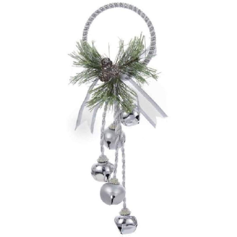 Product Description- Silver and White Metal Bell With Pinecone Door Hanger Silver and White Bell Door Hanger More Information UPC 086131330025 Split 6 Case 36 Color Silver Item Size 13in Packaging Hang Tag