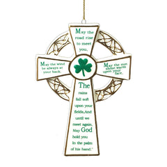 - This Kurt Adler 5. 12-Inch Porcelain Irish Cross Ornament is a beautiful way to add to your holiday décor and bring Irish blessings to your home. Its white porcelain design cross design is circled with a celtic knot and displays the following in green print: may the road rise to meet you, may the wind be always at your back, may the sun shine warm upon your face, the rains fall soft upon your fields, and until we meet again, may God hold you in the palm of his hand.