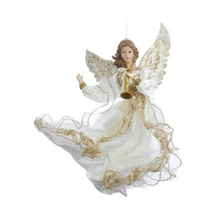 - This 12-Inch Ivory and Gold Angel Ornament from Kurt Adler is a beautiful and festive addition to any Christmas tree. Its design features a beautiful angel wearing an ivory gown trimmed in gold, with matching wings an a golden trumpet.