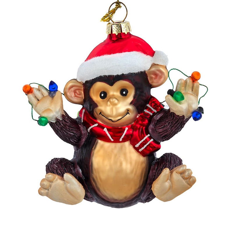 - This glass monkey ornament from Kurt Adler is a festive addition to any holiday décor or Christmas tree. It features a monkey wearing a red and white Santa hat with a strand of multicolor Christmas lights.