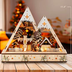 - This 11.4-Inch Battery-Operated Wooden Light Up Mountain Village with Santa with Santa from Kurt Adler is a beautiful and unique addition to any holiday décor. Its design features two small buildings, snow-dusted trees, and Santa and sleigh with reindeer. When switched on, this village lights up with LED lighting for a festive glow.