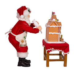 - Part of Kurt Adler's Fabriché collection, this 10. 5-Inch Battery-Operated Fabriche Santa Decorating LED Gingerbread House from Kurt Adler is the perfect addition to your holiday décor! This set features Santa in his classic red-and-white suit with an apron and holly leave accents. Gingerbread men line the bottom of his apron and in his hand is a piping bag. A decorated elaborate gingerbread house sits on a table lined with a red table cloth with the words "Merry Christmas".
