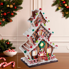 - Add a sweet touch to your holiday décor with this 13“ battery-operated LED Gingerbread house from Kurt Adler. This table piece features a three-layered gingerbread cookie house decorated with white frosted roofs, red and green candy drops, red and white peppermint candies and a gingerbread couple standing on a gingerbread base.