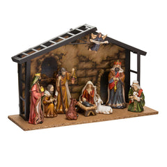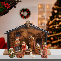 - This Kurt Adler 3.5-inch - 5-inch Porcelain 10-Piece Nativity Set is a beautiful way to add to your holiday décor while remembering the true meaning of Christmas. This Nativity set includes 9 figurines that can be positioned anywhere in the set, including the Holy Family, the Three Kings, a shepherd, a lamb and a donkey. Also included is a beautifully-detailed metal crèche with a painted background revealing a starry night sky through a doorway and a window; the crèche is topped with a large, ornate star.