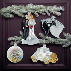 - This Noble Gems™ wedding ornament set of four from Kurt Adler is the perfect wedding gift, sure to be treasured by the happy couple year after year. These ornaments feature wedding icons with glittery accents including a bride and a groom, a white antique car that says, “Just Married,“ a set of golden wedding bells that say, “Mr. and Mrs.“ and bride and groom-style hearts that say, “From This Day forward.“ The ornaments come packed in a white gift box set. A perfect wedding gift for the newly married couple.