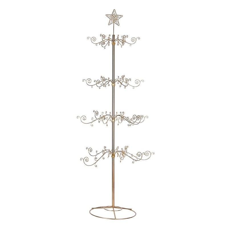 - This Kurt Adler 7-foot gold metal tree is a unique, festive way to add to your holiday décor. This tree has an all-metal gold design, with boughs that come to swirled flourishes at the ends and an ornate metal star at the top.