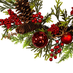 - This 24“ Un-Lit Decorated Green Rattan Wreath is a beautiful way to add to any home or holiday décor. This wreath is Un-Lit and is decorated with red ball ornaments, pinecones, and red berry clusters for a festive touch. The contrast of the red and green makes this wreath really stand out.