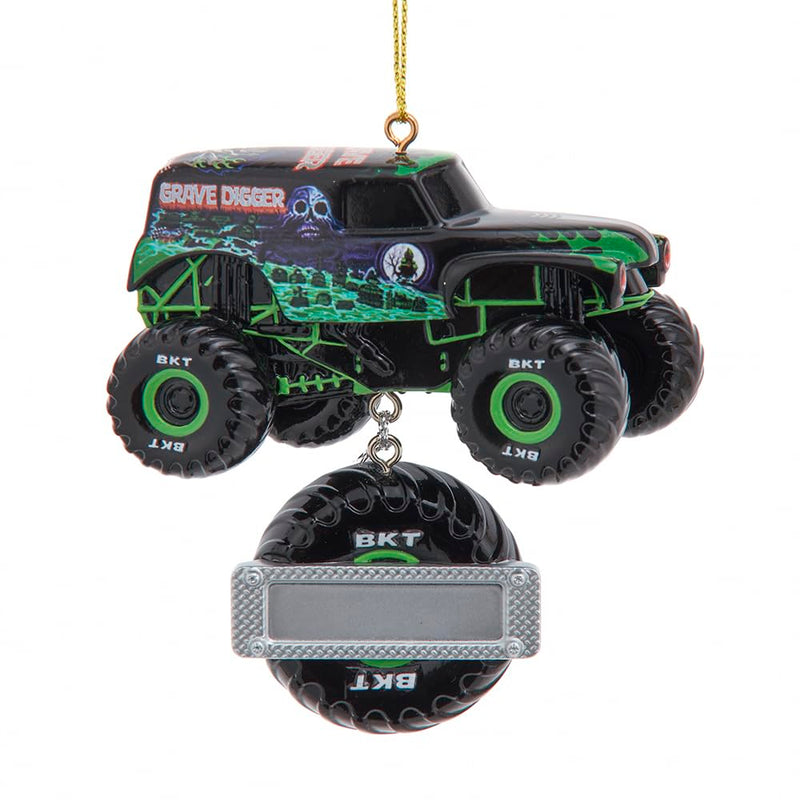 - This Monster Jam Grave Digger Ornament for Personalization from Kurt Adler is a thrilling and customizable addition to your holiday decor that celebrates the legendary Grave Digger monster truck. This ornament offers the opportunity to add a personal touch to your Christmas decorations by including a name, date, or special message, making it a unique and cherished keepsake for fans of Monster Jam. Crafted with meticulous attention to detail, the Grave Digger Ornament features a detailed replica of the iconic Grave Digger monster truck, complete with its signature green and black design and menacing grin. The ornament's realistic appearance captures the essence of the legendary monster truck and adds a touch of excitement and adrenaline to your holiday decorations. You can have a name, date, or special message added to the ornament, making it a one-of-a-kind keepsake that commemorates a special occasion, a fan's love for Monster Jam, or simply adds a personal touch to your holiday decor. It brings the thrill of Monster Jam to your holiday celebrations and allows you to create a special and personalized ornament that will be treasured for years to come. Capture the excitement of Monster Jam and make your holiday decor uniquely yours with the Grave Digger Ornament for Personalization. Let it remind you of thrilling monster truck events and make it a special part of your holiday traditions.