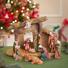 - Celebrate and remember the true meaning of Christmas with this resin Nativity set with figures and stable from Kurt Adler. This set includes a stable topped with an angel holding a sign that reads "Gloria," and 10 resin figures. Included are the baby Jesus, Mary, Joseph, the three wise men, a Shepherd, a cow, a lamb, and a Donkey