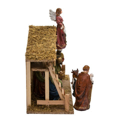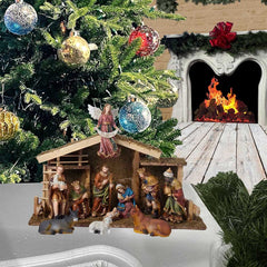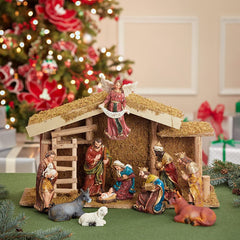 - The Kurt Adler 12-Piece Nativity Set with Wooden Stable is a classic, traditional way to add to your holiday décor. This moss covered wooden stable houses all the key figures of the First Christmas in painted porcelain: the Holy Family, the Three Wise Men, a shepherd, a cow, a donkey, a sheep, and an angel holding a sign that reads, "Gloria". It will undoubtedly serve as a reminder of the true meaning of Christmas throughout the busy holiday season.