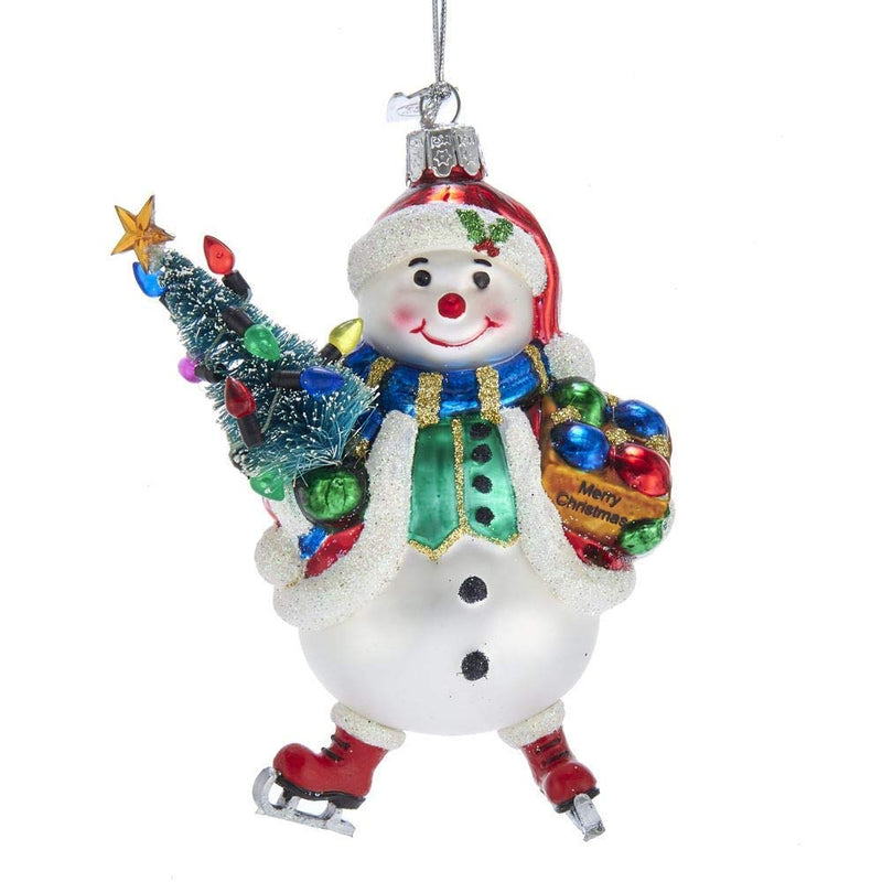 - This Noble Gems™ glass snowman ornament from Kurt Adler is a charming addition to any home or holiday décor. This snowman is wearing a red and white glittered coat, a blue and gold glittered scarf and a Santa hat. He is carrying a decorated Christmas tree in one hand and a box of “Merry Christmas“ ornaments in the other hand. Part of the Kurt Adler Noble Gems™ collection | Hangs from silver string | Made of glass and paint/mica More Information UPC 086131491191 Split 8 Case 32 Color Multicolor Item Size 5in Packaging Bulk Pack