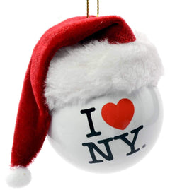 Kurt Adler Plastic Ornament for Christmas Tree, I Love NY Ball with Fabric Santa Hat, 3.5" | NY9121