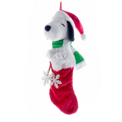 - This Kurt Adler 21-inch Peanuts Snoopy Plush Head Stocking with Snowflake Dangles is a fun, festive way to add to the holiday decor of any Peanuts fan. Sticking out of the top of this classic red and white stocking is a large plush Snoopy wearing a Santa hat and a green and white striped scarf. Dangling from his hands are two large snowflakes.
