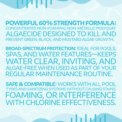 Effective in preventing the growth of green, black, and mustard algae. Ideal for all-around use in pools with attached spas and water features.