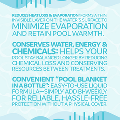 Liquid Solar Cover forms a thin layer of protection on the surface of your pool. When used bi-weekly, this product will prevent excessive water evaporation, minimize heat loss, and reduce the amount of pool chemicals needed to maintain your pool.