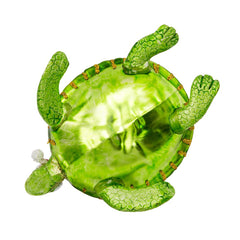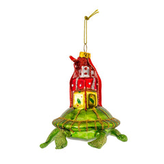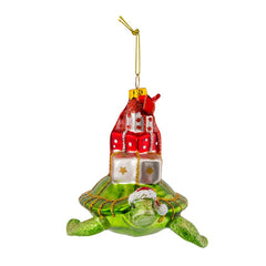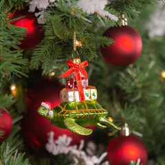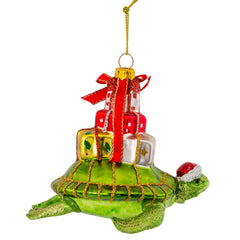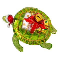 - This Kurt Adler 4" Glass Turtle with Gift Ornament is a fun way to add to your holiday décor! Perfect for animal-lovers, this green turtle's shell is adorned with gold glitter detailing, and is topped with a stack of colorful, ornately-wrapped gifts. The turtle's face is detailed with large, dark eyes, and its skin is detailed to appear textured and life-like. It is wearing a small, adorable red and white Santa hat, for a festive touch!