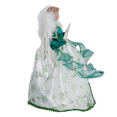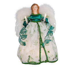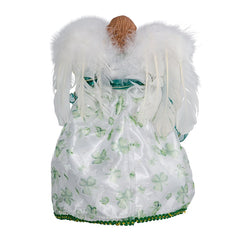 Product Description- This Kurt Adler UL 10 Light 12-inch Irish Angel Treetop is a beautiful and festive way to add to your holiday décor. This strawberry blonde angel wears an white and green shamrock-accent gown. The top of her gown is a long sleeved vibrant green. The bottom half of her gown is white and accented with green shamrocks. In between each of her arms are long green ribbons. To complete her angelic look fluffily white angel wings are attached to her back while she stands with a candlestick in each hand.