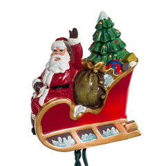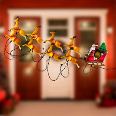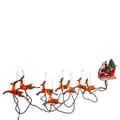 - This Kurt Adler Santa sleigh and eight reindeer light set is a festive way to add to the lighting of your Christmas tree or holiday décor! This novelty light set features Santa Claus being pulled by his eight reindeer. Santa is sitting in his red, gold-trimmed sleigh, which is carrying a green Christmas tree and a sack full of gifts. He is happily holding his belly and waving. The eight tiny reindeer are all in a leaping position and are wearing red reins and brown antlers.