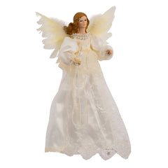 - This Kurt Adler 14.5" 10-light Ivory Angel Treetop is a beautiful, classic way to accent your Christmas tree. Dressed in a long, ivory dress adorned with lace trimming and detailing, this angel has white feathery wings, brown hair. When plugged in, she is illuminated from within by 10 clear incandescent bulbs. This treetop is for indoor-use only.