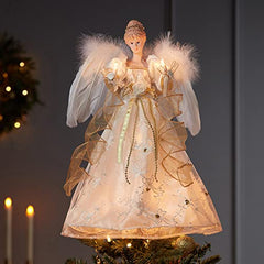 - This Kurt Adler ivory and gold angel treetop is a beautiful, classic way to accent your Christmas tree. Dressed in a long, white dress adorned with rhinestones, gold ribbon and beading, this angel has white feathery wings, blonde hair and is holding two candles which light up.
