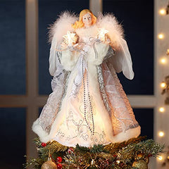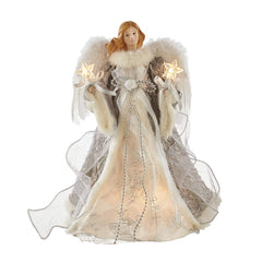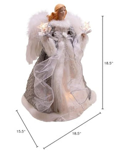 - This Kurt Adler Silver and Gray Angel Treetop is a beautifully classic way to decorate your Christmas tree. Dressed in a long white gown with silver and grey detailing and embroidery, this blonde angel has sequin and large feather wings and is holding two light-up stars in her hands. She is a lovely finishing touch to any Christmas tree!
