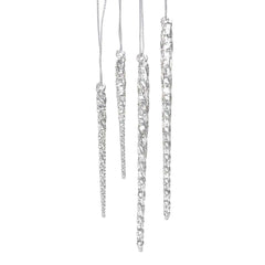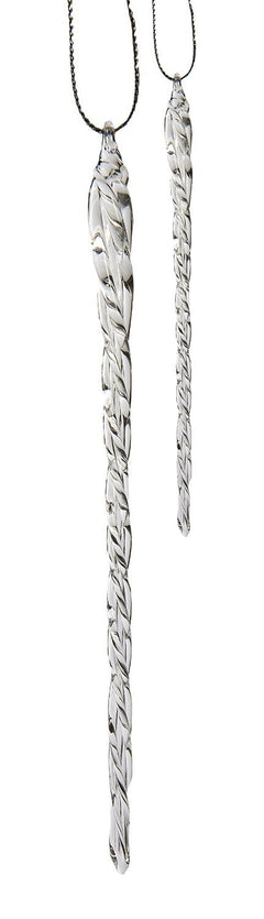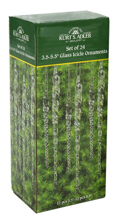 - This Clear Glass Icicle Ornament Set by Kurt Adler is a beautiful, classic way to add to your holiday décor. Ranging in size from 3-1/2 inches to 5-1/2 inches, each icicle ornament features a beautifully realistic dripping design, perfect for adding an icy, wintry feel to your Christmas tree. Each box contains 24 pieces. Grab these classic icicle ornaments today for a timeless additional to your holiday ornament collection.